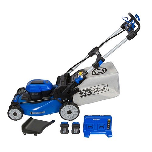 The Kobalt 2x24V brushless motor self-propelled lawn mower provides superior performance without the noise mess and fumes of gas. It features a self-propelled rear-wheel drive with variable speed control for maximum control and handling. The one-handed telescopic folding handle allows for convenient vertical storage. Single-lever 6-position deck height adjustment to quickly adjust for your preferred grass height. Kobalt Kobalt 20-in 5 Ah 48 V Brushless Self-Propelled Cordless Lawn Mower - Batteries and Charger Included KLMS 2524A-03 Kobalt 20-In 5 Ah 48 V Brushless Self-Propelled Cordless Lawn Mower - Batteries And Charger Included Rona.